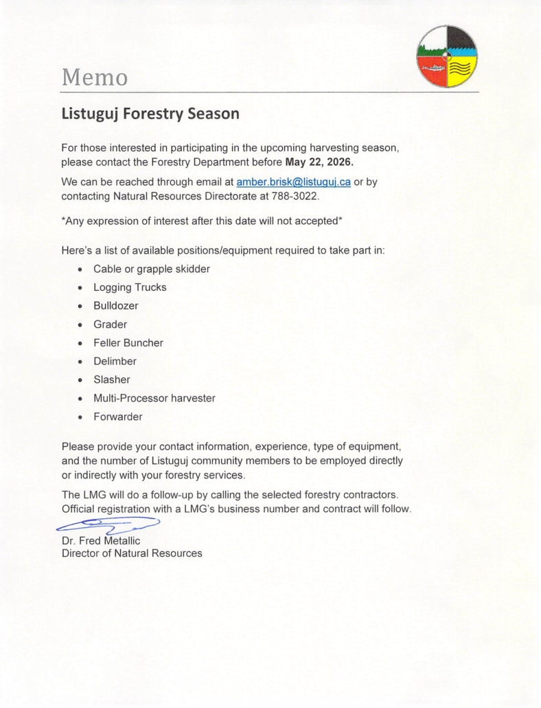 Please see the following memo from our Natural Resources Directorate detailing an Expression of Interest for the 2026 Forestry Season.
