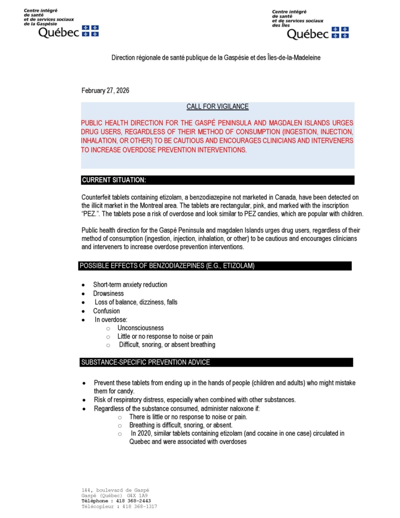 Public health direction for the Gaspé Peninsula and magdalen Islands are urging drug users to be cautious of dangerous substances circulating.