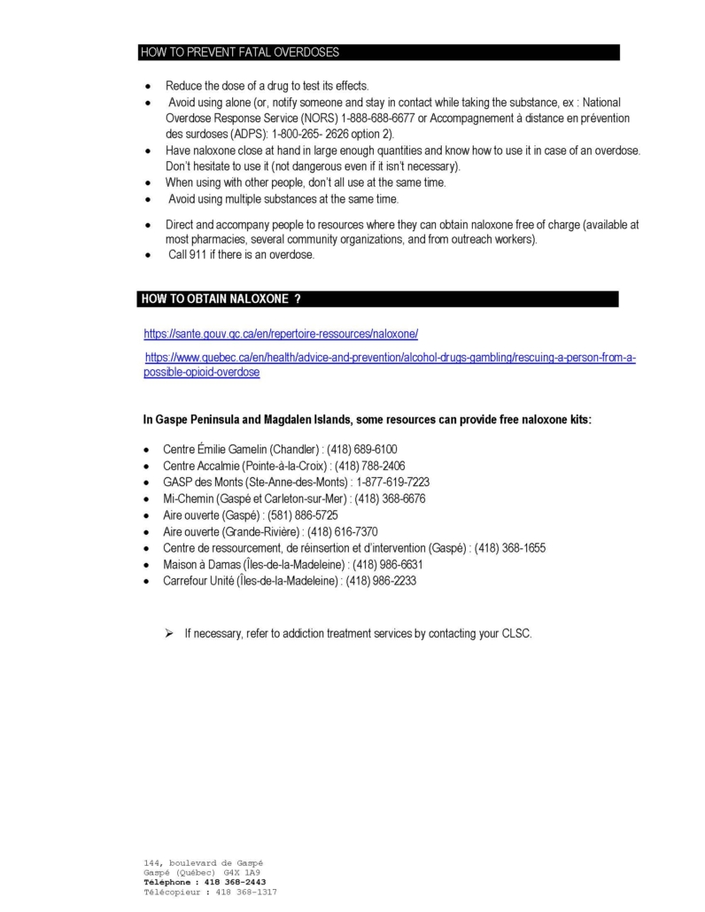 Listuguj Community Health Services has Naloxone take-home kits available for pickup to community members. For more information, stop by the Health Centre at 6 Pacific Dr., or call 418-788-2155.