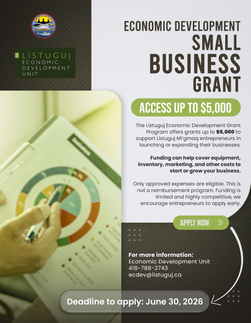 The Listuguj Economic Development Grant Program offers grants up to $5,000 to support Listuguj Mi’gmaq entrepreneurs in launching or expanding their businesses.