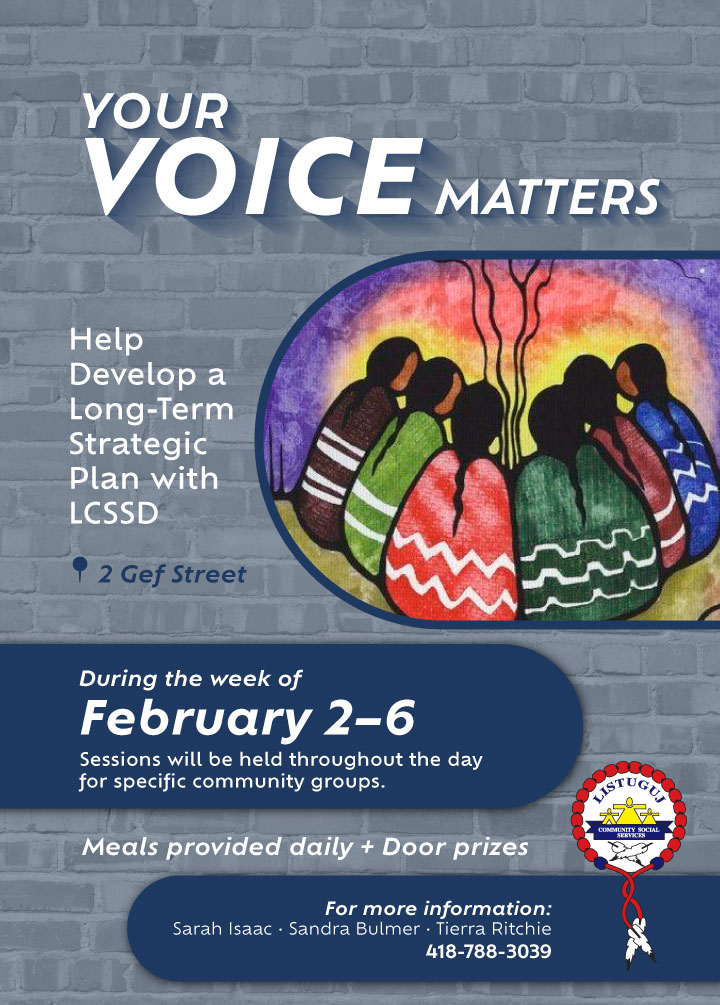 During the week of February 2nd to the 6th there will be multiple sessions being held throughout the day for specific community groups to help develop a long-term strategic plan with the Listuguj Community Social Services Directorate.