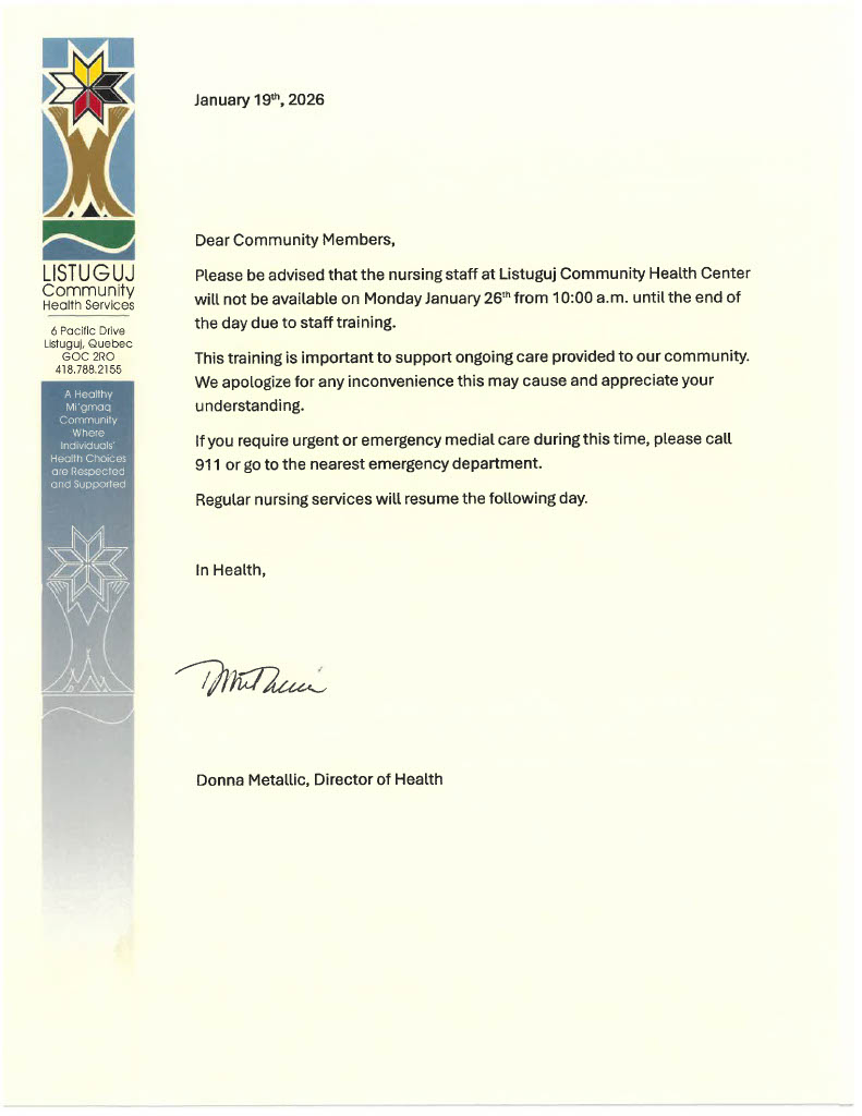 Please see this message from the Director of Health, Donna Metallic regarding the nursing staff’s availability on Monday, January 26th from 10:00 am to the end of the day.