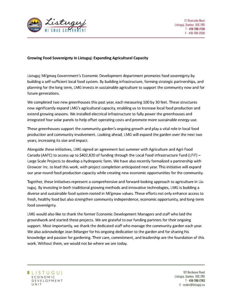 Please see the following public announcement from Economic Development regarding the expansion of Listuguj’s agricultural capacity and food sovereignty.